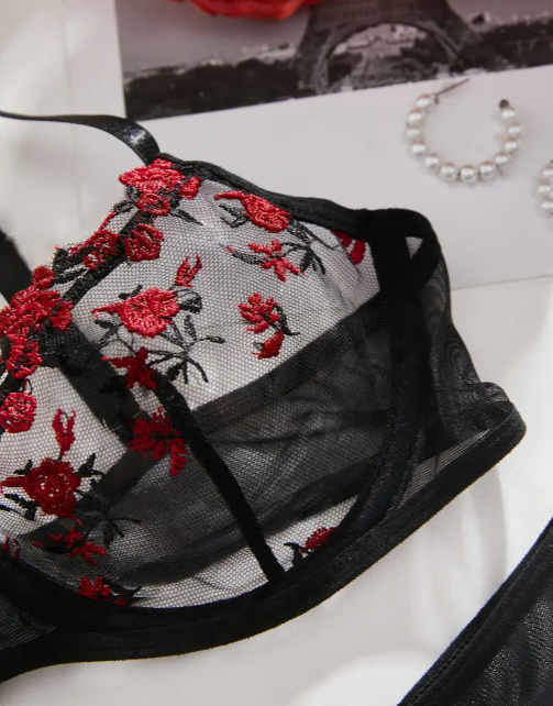 Float into fantasy with this fairy core-inspired floral lace bra and brief set. Featuring unlined cups, adjustable straps, and delicate embroidery, this lingerie set blends ethereal charm with a hint of mischief.